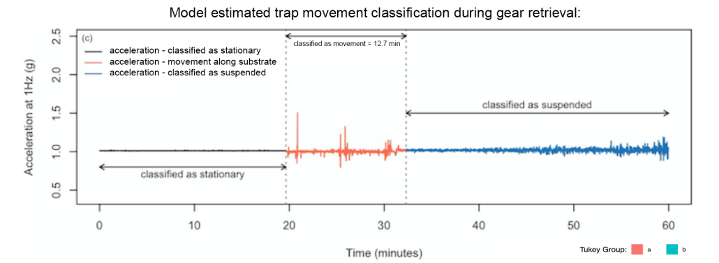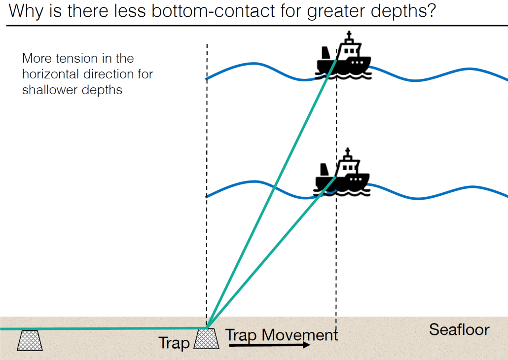 - There is more trap bottom contact and gear movement at shallower depths. Other factors (e.g. trap position, weather, vessel) may also affect trap bottom contact.